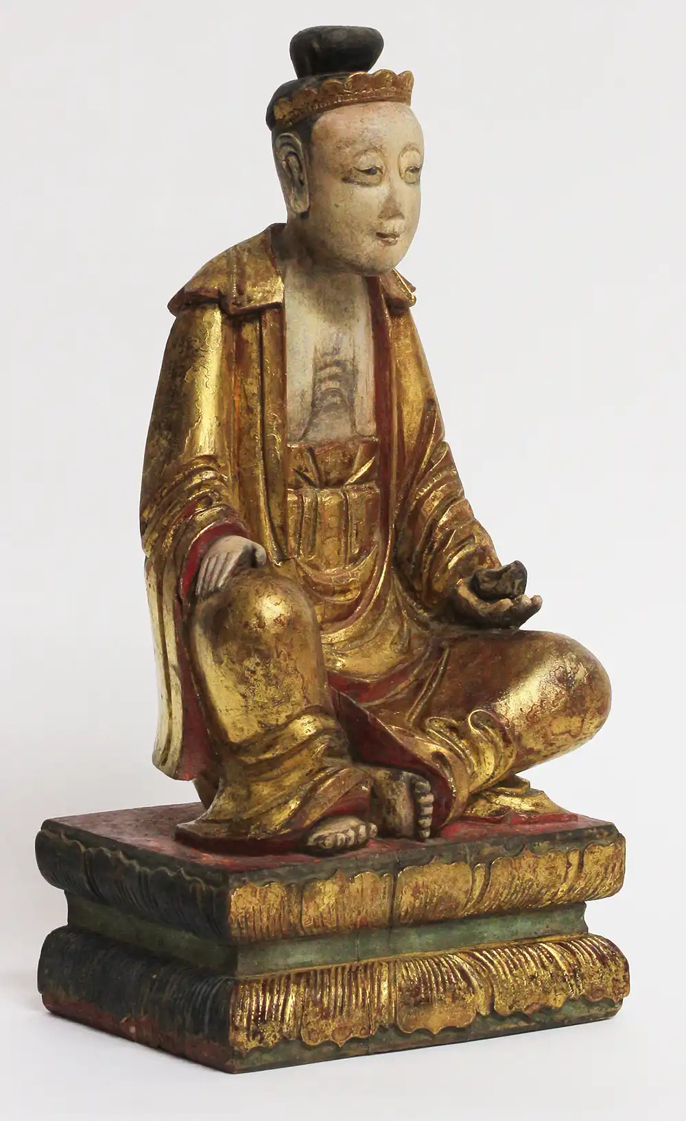 Der Buddha zeigt sich im Meditationssitz, in weite Mönchsgewänder gehüllt, auf einem zweifach gegliederten Lotusthron. Die mandelförmigen Augen sind fast geschlossen und die Hände ruhen in einer Meditationsgeste auf den Beinen. Die rechte Hand ruht auf dem rechten angewinkelten Bein, seine linke Hand liegt auf dem linken Bein in „dhyana mudra“ und hält eine Schale in der Hand. Der Buddha ist bekrönt und die Haare sind zu einem Dutt geformt. Gewänder, Bekrönung und Teile des Lotusthrons sind über Rotlack vergoldet, sonst polychrom gefasst. Am Rücken befindet sich eine Öffnung für Weihegaben.