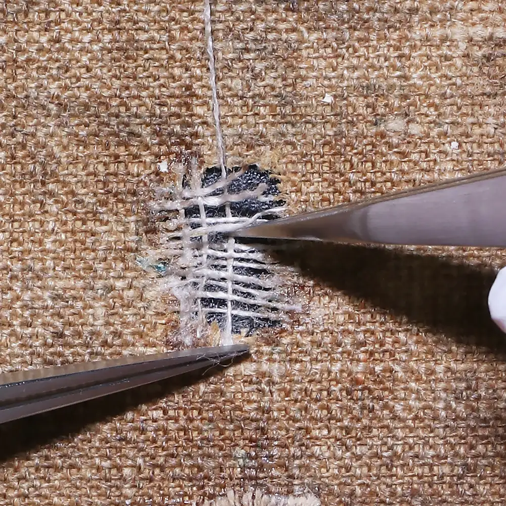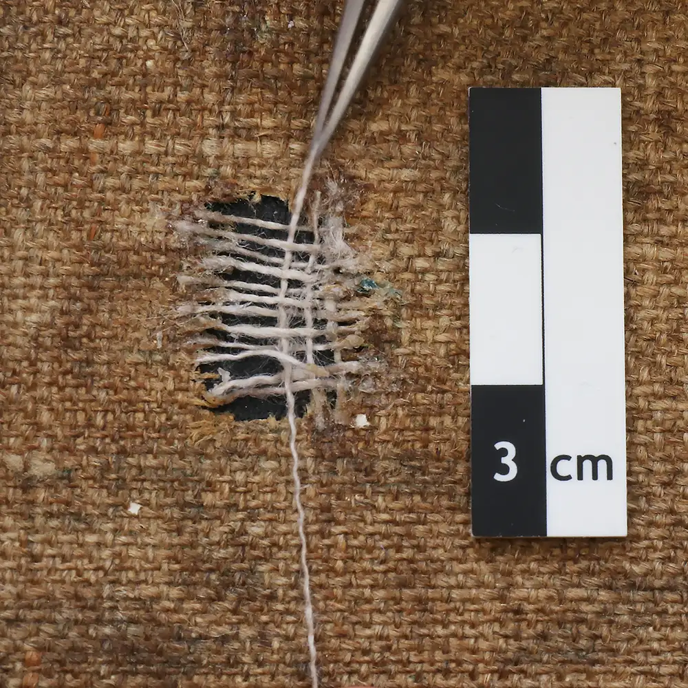 Bei der eigentlichen Instandsetzung bevorzuge ich die minimalinvasive Methode der Einzelfadenverklebung unter dem Mikroskop. Dabei führe ich jeden gerissenen Kett- und Schussfaden einzeln mit der Pinzette zusammen und verbinde sie mit einem stabilen, alterungsbeständigen Klebstoff. Sollte der Riss unter einer besonders starken mechanischen Spannung stehen, setze ich zusätzlich feine Fadenbrücken ein, um die Zugkräfte gleichmäßig abzufangen, ohne die Rückseite durch großflächige Flicken zu beschweren. Mein Ziel ist es immer, dass die Reparatur von vorne unsichtbar und von hinten strukturell stabil ist.