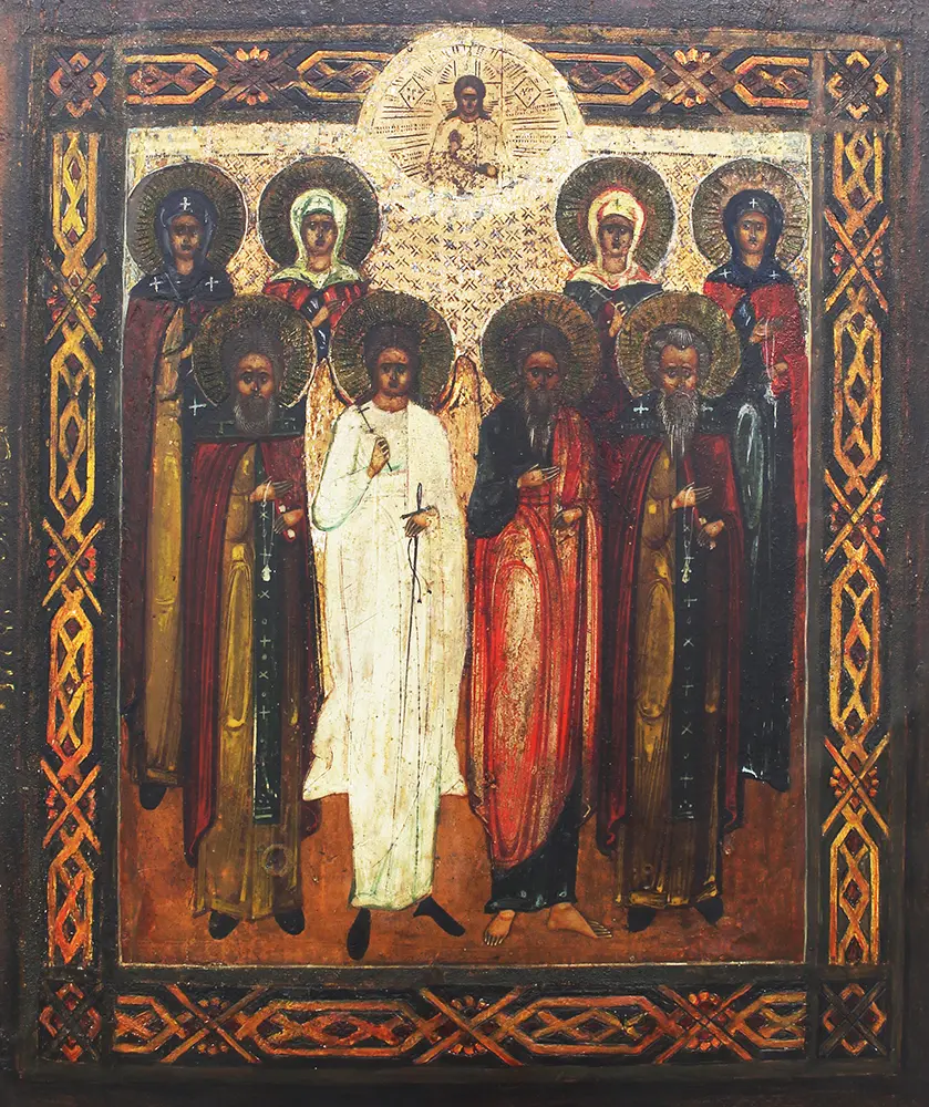 Bei der vorliegenden Ikone (Versammlung auserwählter Heiliger) wurden spätere Übermalungen abgenommen und die Ikone in den originalen Zustand zurückgeführt.