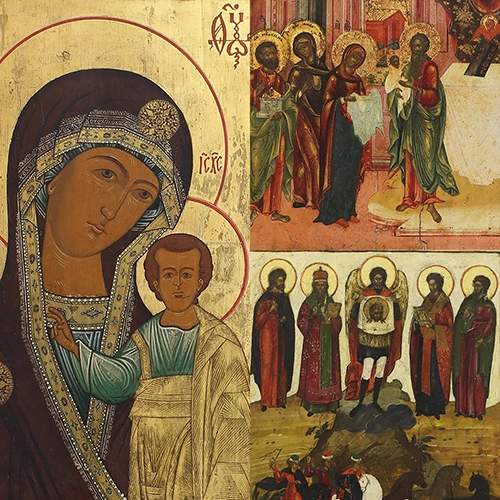 Das Wort Ikone ist aus dem mittelgriechischen eikóna, zu griechisch eikṓn abgeleitet, welches Bild bedeutet. Es handelt sich um Kult- und Heiligenbilder der Ostkirchen, besonders der orthodoxen Kirchen des byzantinischen Ritus.
